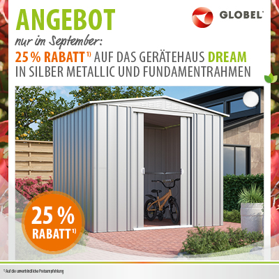 Auch den Gartenmanager Dream von Globel, ein feuerverzinktes Gerätehaus mit Satteldach und integrierter Schiebetür, sollten Sie sich noch im September sichern, denn hier schrumpft die UVP um satte 25 %.