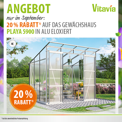 Das Gewächshaus Playa ist in zwei Größen, zwei Verglasungsoptionen und in zwei Farben erhältlich – im September bekommen Sie auf das Playa 5900 in der Farbe Alu eloxiert bei teilnehmenden Händlern 20 % auf die UVP.